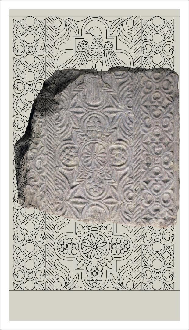 Limitada por duas faixas laterais de decoração geométrica, o centro da peça organiza-se em grandes molduras sobrepostas quadrilobuladas, dentro das quais se esculpiram elementos vegetalistas e geométricos e, na moldura superior, uma águia, de que restam a cauda e as duas garras. O modelo é semelhante a outras realizações artísticas bizantinas da mesma época. Esta semelhança leva a pensar que, à Lisboa moçárabe do século X, terão chegado obras de arte bizantinas (possivelmente tecidos), que serviram de inspiração aos escultores encarregues de decorar um dos templos da comunidade moçárabe local.