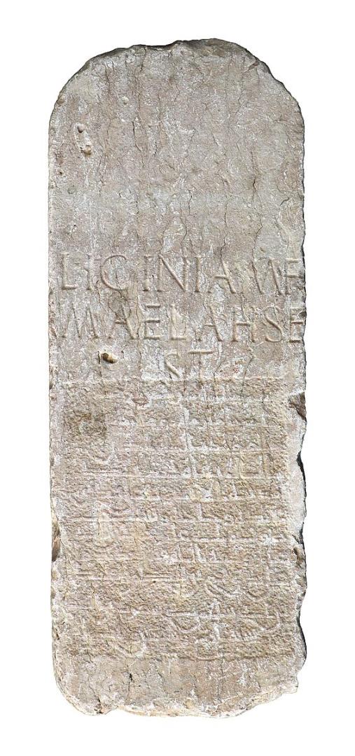 Com uma inscrição funerária do século I d.C., relativa a uma cidadã romana de Olisipo, Licinia Mela, filha de Marco, esta estela foi, em finais do século X, reaproveitada para nela se inscrever outra inscrição, em língua árabe. Trata-se de um texto glorificador da ação de dois homens fundamentais na política peninsular do final do califado omíada: o califa Hisham II e o seu general, Almançor, a quem ficou a dever-se uma importante obra na alcáçova (fortificação) de Lisboa, realizada no ano 985, que a epígrafe laudatória considera uma «restauração da cidade de Al-usbuna».