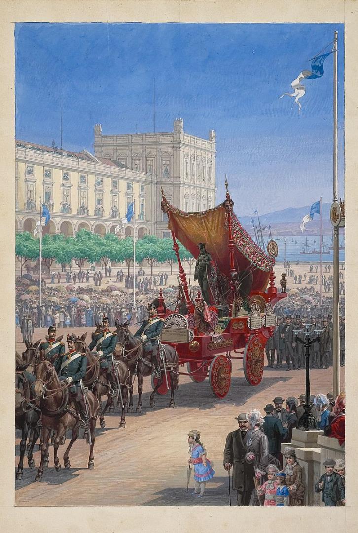 Representação do Carro Triunfal das Colónias, idealizado pelo pintor Columbano Bordalo Pinheiro (1857-1929). Na Praça do Comércio, três parelhas de cavalos puxam um carro transportando uma exótica escultura feminina, envergando trajes indígenas, coroada, sob um pálio, o qual é constituído por uma colcha da Índia, bordada e suspensa por lanças. Sobre esse pálio eram exibidos objetos artísticos provenientes das então colónias ultramarinas.  Ao fundo é visível o Torreão nascente da Praça do Comércio, com árvores em frente da arcaria da praça. Estas foram introduzidas por proposta do vereador Polycarpo Santos, na sessão de Câmara de 11 de dezembro de 1865 e retiradas na década de 1920, por pressão exercida pela Real Associação dos Arquitetos.