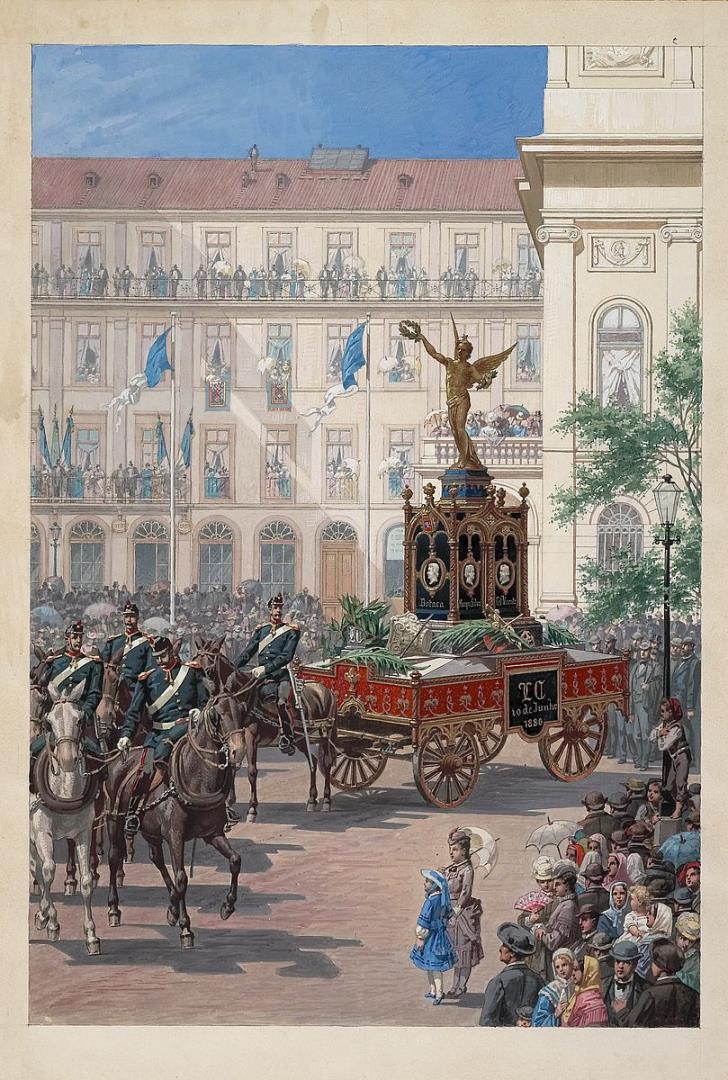 Representação do Carro Triunfal das Artes, projetado pelo escultor J. Simões de Almeida (1844-1926) e executado por Leandro Braga (1838-1897). Três parelhas de cavalos puxam um carro com uma estrutura arquitetónica ao gosto neomanuelino, decorado com medalhões alusivos a grandes vultos da arte nacional - Boitaca, Gil Vicente, Sequeira(?) e Joaquim Machado de Castro(?) - rematado por símbolos relacionados com as artes e servindo de pedestal a um "anjo da vitória". O carro desfila no largo D. João da Câmara, junto da Estação Ferroviária do Rossio, designado de Largo de Camões, até 1924.
