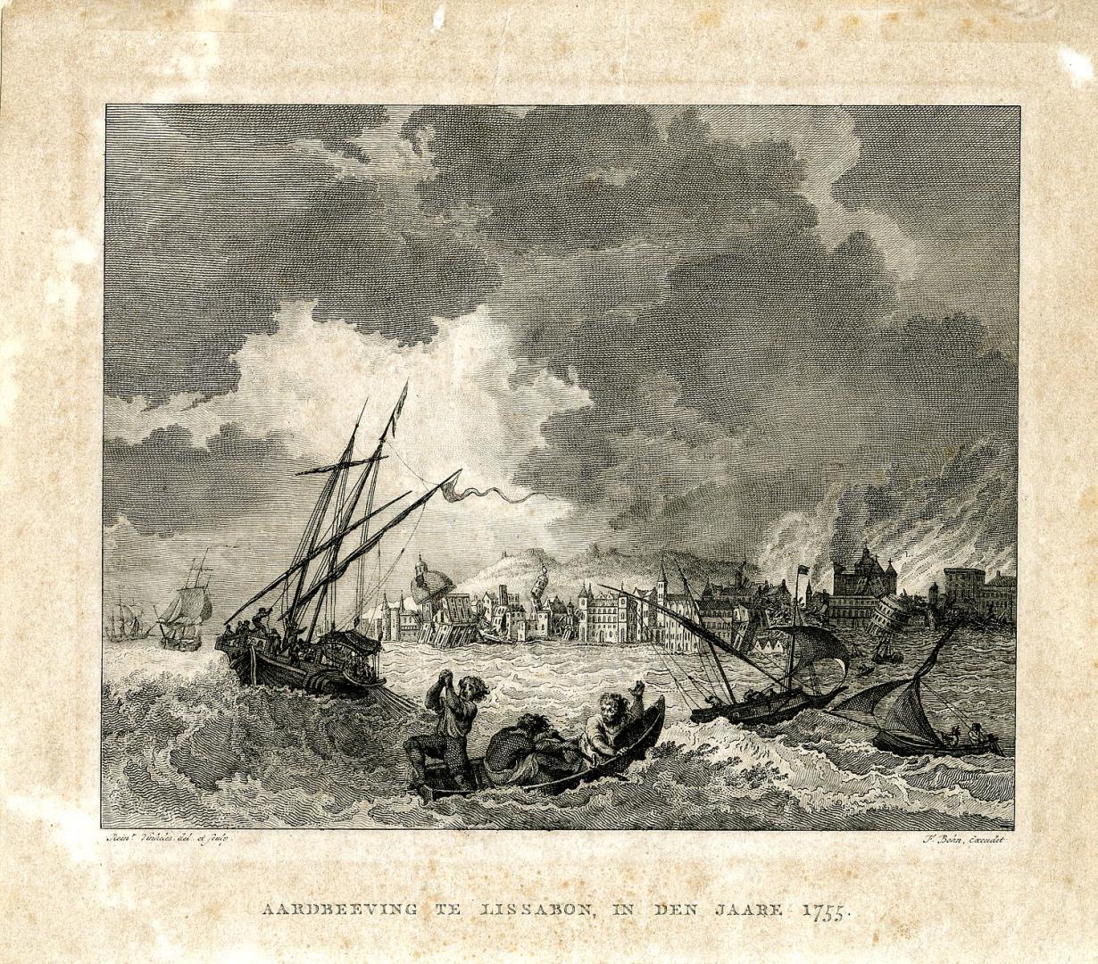 Embora posterior aos acontecimentos de 1755 em algumas décadas, esta vista parcial de Lisboa é mais uma das muitas perspetivas idealizadas da cidade durante o terramoto que circularam pela Europa. Enquanto o torreão do paço real se desmorona, alguns habitantes tentam a fuga por barco, enfrentando um rio revoltoso que os fará sucumbir sob as ondas do maremoto. Em primeiro plano, exibe-se uma dessas tentativas, em que três figuras se fizeram ao rio num pequeno batel, estando uma delas em posição de oração, suplicando o auxílio divino ante a morte certa.