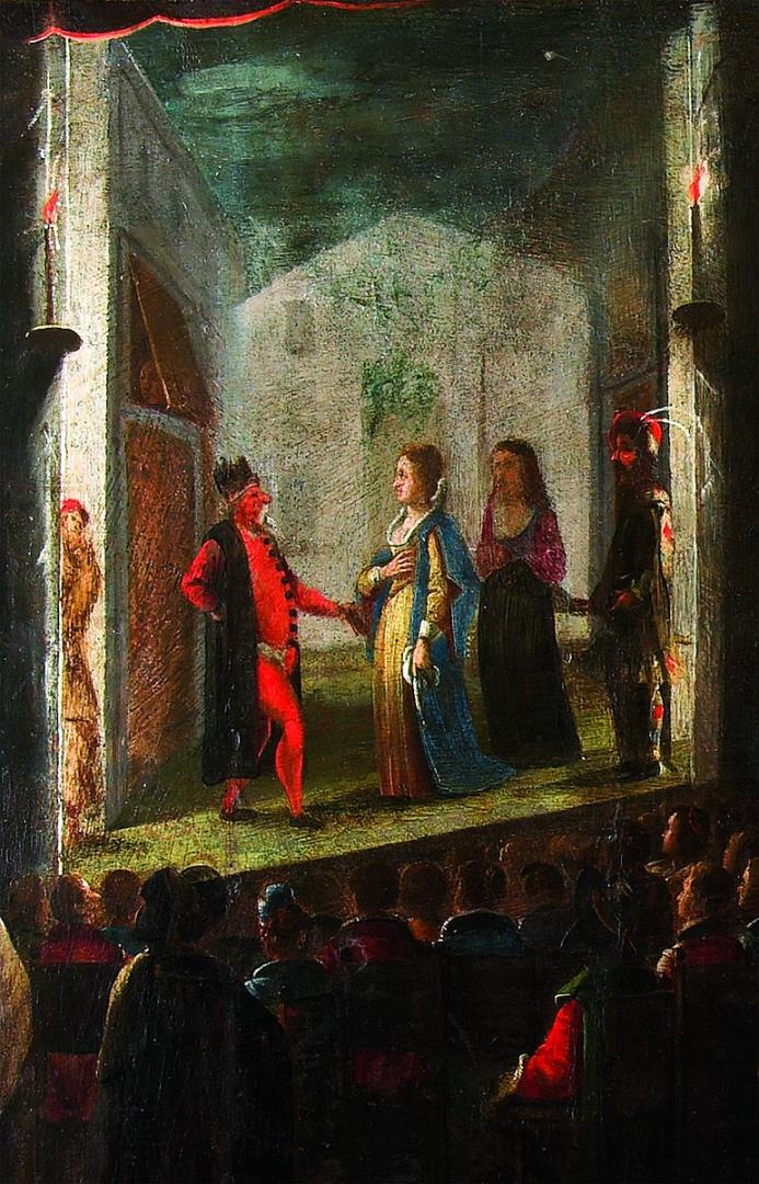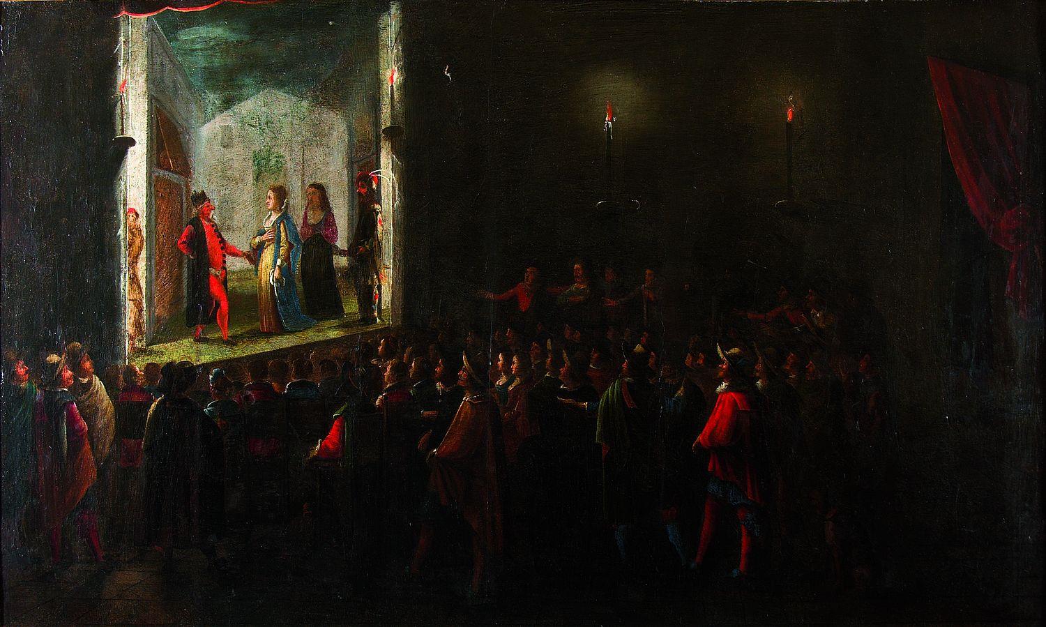 Esta pintura deve ilustrar um espetáculo teatral privado, pois retrata um ambiente noturno, iluminado por tochas, com plateia maioritariamente composta por nobres, ao contrário da obrigatoriedade de representação diurna nos chamados pátios de comédias.