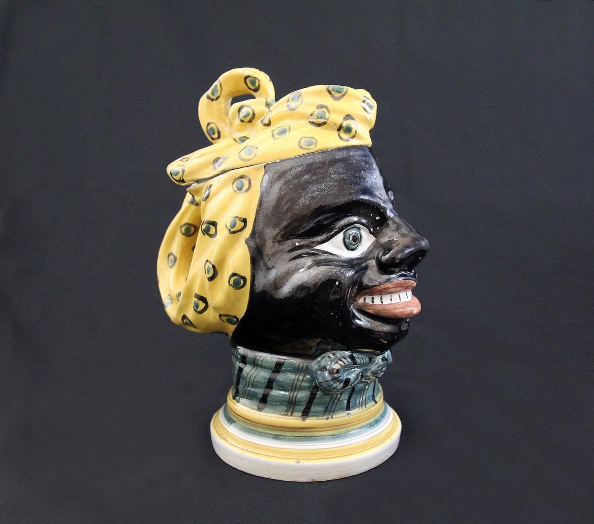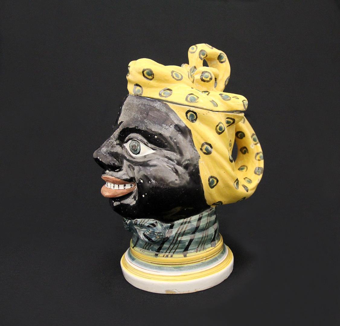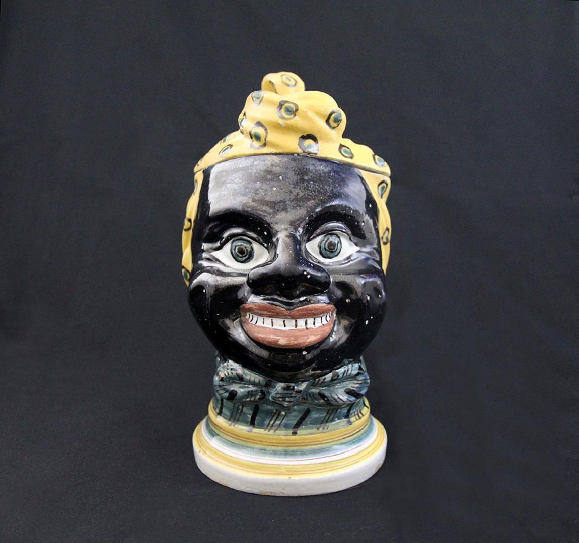 Esta exótica peça em cerâmica possui uma tampa, pelo que é provável que tenha sido concebida como caixa de tabaco, planta cultivada no Brasil por escravos africanos.