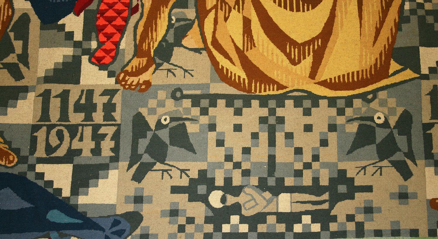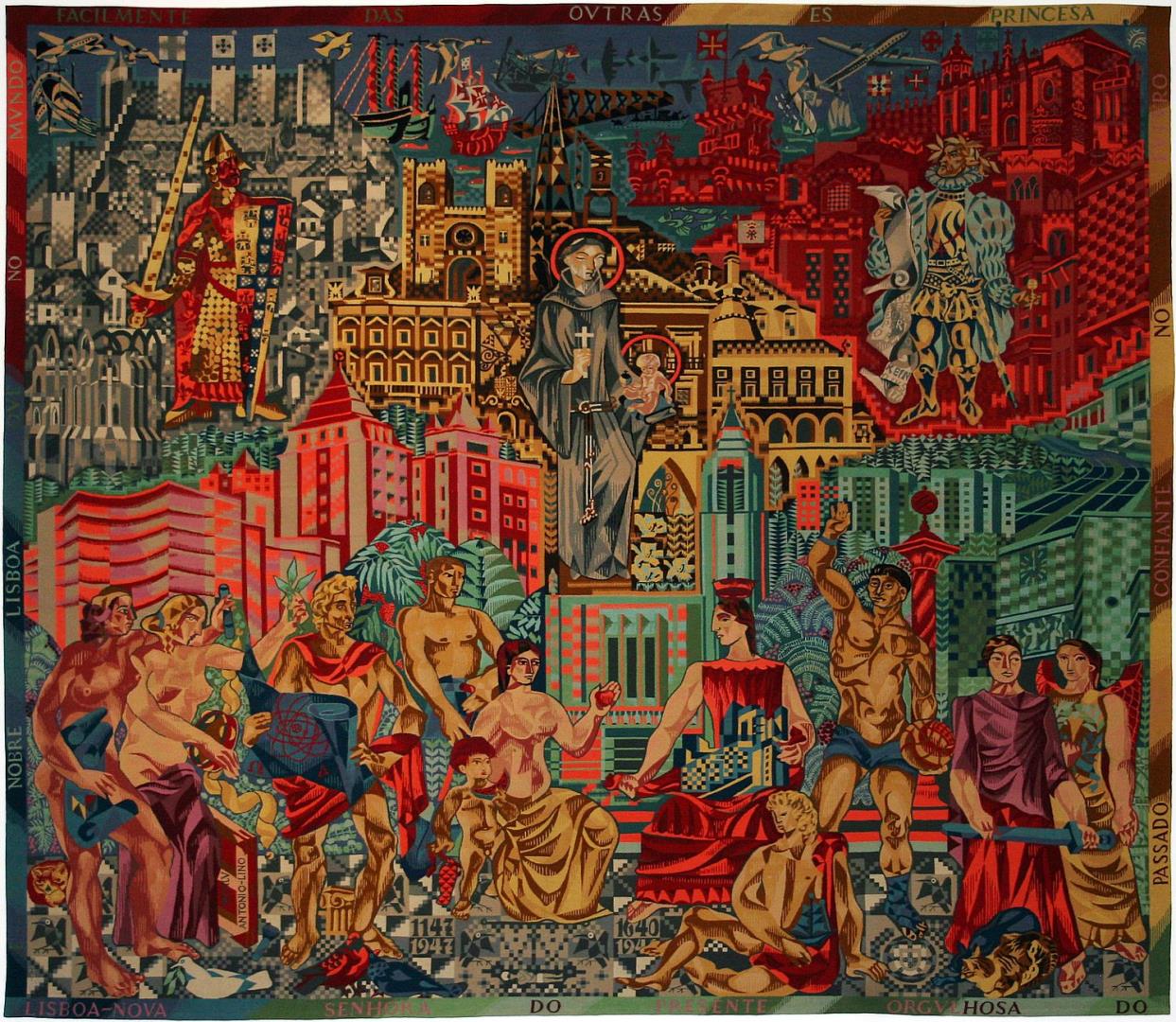 Executada pela Manufactura de Tapeçarias de Portalegre, segundo cartões de António Lino (1914-1996) datados de 1955, a peça foi expressamente encomendada pela Câmara Municipal de Lisboa, sendo exemplar único. O contrato celebrado entre esta entidade e o artista estabeleceu um programa iconográfico em torno da evocação da cidade de Lisboa e das suas colinas, através de algumas edificações que nos remetem para um período que se inicia com a fundação da nacionalidade e se prolonga até meados do século XX. As figuras de D. Afonso Henriques, Santo António e Camões encontram-se colocadas, estratégica e respetivamente, junto ao Castelo de São Jorge, à Sé de Lisboa e à “cidade dos Descobrimentos”, esta última representada, nomeadamente, pelo Mosteiro dos Jerónimos. A “cidade atual”, da qual nos fala o referido contrato, é ilustrada por diversos empreendimentos levados a cabo durante o período do Estado Novo, como a Tribuna Presidencial do Estádio Nacional, a autoestrada para Cascais ladeada pelo polo florestal de Monsanto, a Casa da Moeda e a Igreja de Nossa Senhora de Fátima. Na metade inferior da tapeçaria estão dispostas algumas figuras simbólicas, entre as quais a Família, célula base da sociedade do Estado Novo, aqui evocada por um conjunto composto por um homem, uma mulher e uma criança. Uma figura adornada de coroa mural personifica a “Lisboa-Nova”, um dos motivos que, segundo o contrato, deveria constar na obra. Observa-se ainda a embarcação com os dois corvos que velam os restos mortais de S. Vicente, presente no brasão da cidade de Lisboa, e os dois pares de datas 1147-1947/1640-1940, que remetem para um ciclo de grandes festividades em torno da Cidade e da Nação, como as Comemorações do VIII Centenário da Tomada de Lisboa aos Mouros, em 1947. O espírito nacionalista do Estado Novo, com forte carga simbólico-propagandística, está ainda patente numa das legendas da obra: “Lisboa-Nova, Orgulhosa do Passado, Senhora do Presente e Confiante no Futuro”.