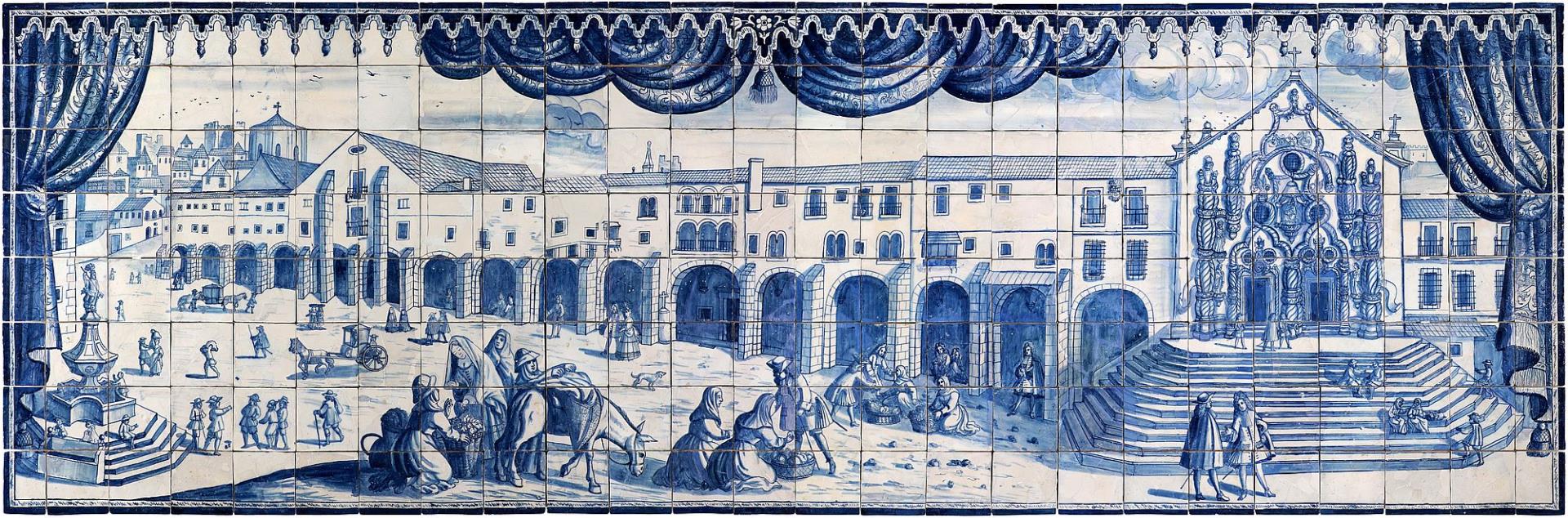 Painel figurativo datado dos inícios do século XVIII, proveniente de oficina de Lisboa, representando a fachada do Hospital Real de Todos-os-Santos, voltado ao Rossio. Num primeiro plano são representados alguns tipos populares, comercializando bens de consumo. Ao lado esquerdo é representado o Chafariz de Neptuno. Toda a cena encontra-se emoldurada por sanefa e sebastos que simulam os brocados com respectivas franjas e borlas.