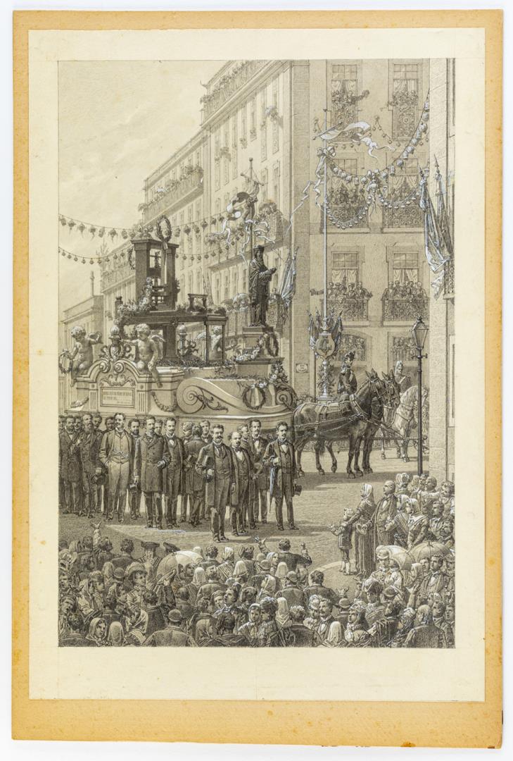 Este desenho faz parte de uma série de obras que retratam momentos importantes do Cortejo Cívico para as Comemorações do Tricentenário da morte de Camões, realizado no dia 10 junho de 1880 e organizado pela Sociedade de Geografia de Lisboa.