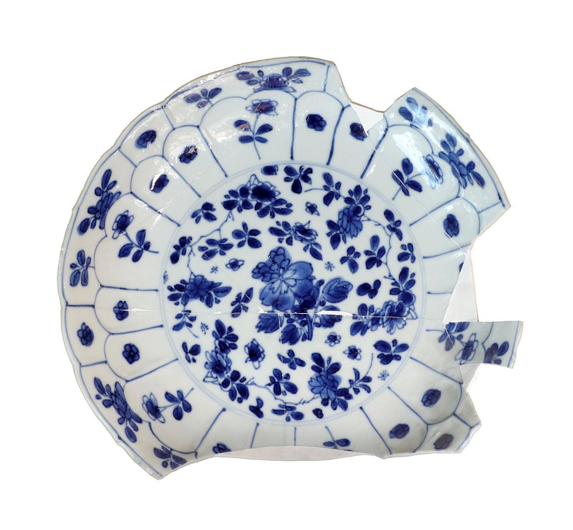 Este prato de porcelana branca com bordo recortado e decorado com motivos florais ilustra o gosto que a alta sociedade lisboeta teve por produções cerâmicas chinesas, trazidas do extremo oriente pelos mercadores portugueses que tinham a sua base nacional em Lisboa. Esta peça em particular data do período da dinastia Qing, reinado de Kangxi (rei entre 1662 e 1722) e deve ter sido importada de Cantão em meados do século XVII. A decoração a azul e branco, sendo comum na produção chinesa deste período, é relativamente secundária e pode explicar-se pelo crescente gosto lisboeta pela associação destas duas cores, que tanto haveriam de singularizar a produção azulejar da primeira metade e meados do século XVIII na cidade. Nesta altura, a Casa dos Bicos não vivia já os tempos áureos do seu (re)construtor, praticamente um século antes, mas o imóvel mantinha o seu estatuto apalaçado e estava ainda na posse dos descendentes de Brás de Albuquerque.