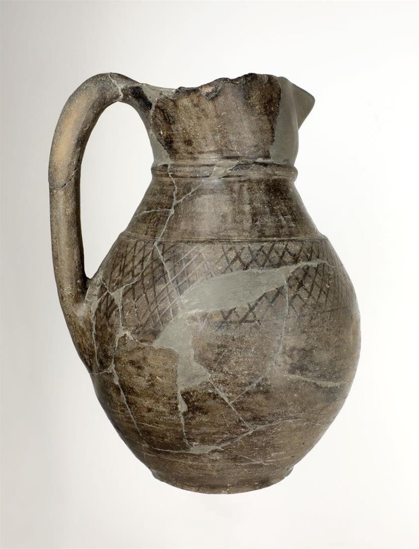 Ao contrário do que os vestígios arquitetónicos provam, esta bilha segue ainda a tradição produtiva da Idade do Ferro, como sugere a sua cor negra e os motivos decorativos geométricos e reticulados brunidos. No mesmo contexto apareceram outras produções cerâmicas itálicas, o que atesta a presença dos primeiros colonizadores romanos e a adoção por parte destes novos habitantes de produções cerâmicas locais, a par de outras de importação. Com uma cronologia a rondar os meados do século II a.C., o núcleo cerâmico do Beco do Forno do Castelo deve ter servido a primeira elite romana a instalar-se em Olisipo.
