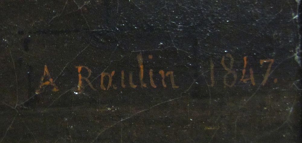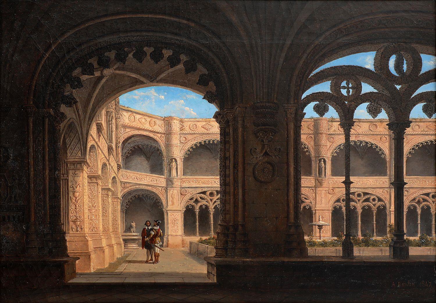 Pintura representando parte do claustro do  Mosteiro dos  Jerónimos, perspetivado a partir do interior. Em primeiro plano, a arcaria abobadada com medalhão representando um sol antropomorfizado, existente na face interna dos pilares da ala sul. Duas figuras masculinas, trajando ao modo do século XVI, conversam no lado esquerdo do claustro, tendo ao fundo a escultura de um animal, provavelmente um cão, assente sobre peanha. Para a direita, desenvolve-se canteiro murado, sobre o qual é visível elemento decorativo de formato discoidal, correspondendo ao repuxo da fonte existente no centro do pátio. O claustro, de planta quadrangular e duplo piso abobadado, apresenta os vãos do piso superior, completamente vazados, tal como existiam antes das campanhas de obras de remodelação/ restauro do monumento, iniciadas a partir de 1860. A reformulação do desenho das janelas, tal como a reformulação da fachada da igreja, decorre entre 1867 e 1878.