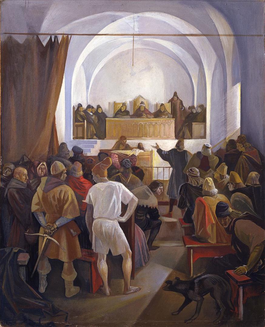 Em 28 de julho de 1753, quando foram adquiridas por 25 mil cruzados “umas casas” no Rossio, a António José de Miranda, o Senado mudou de localização. O “velho” edifício do Largo de Santo António perdeu a função de sede municipal, mas conservou a sua condição de “casa da câmara”, espaço de memória da estreita relação entre o povo lisboeta e o seu “Santo Antoninho”. Esta pintura retrata uma reunião do Senado no século XVI, ocorrida na presença de vereadores, procurador, representantes do clero, homens bons e membros do exército. Executada a têmpera sobre cartão, faz parte de um conjunto de ilustrações de reconstituição histórica, realizadas por Jaime Martins Barata (1899-1970) para a obra Lisboa. Oito Séculos de História, editada pela CML em 1947, no âmbito das Comemorações do VIII Centenário da Tomada de Lisboa aos mouros.