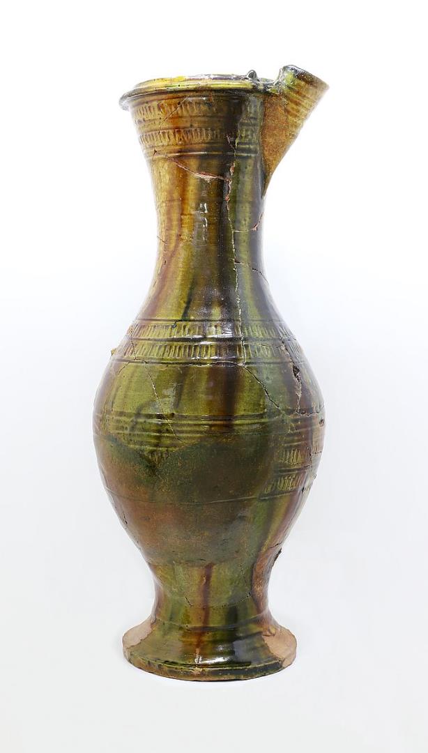 Jarro / Pichel quase completo, de colo alto e bojo ovoide bem proporcionado. Apresenta pé em pedestal cónico e bico semi-tubular no bordo, preservando o arranque inferior de uma asa em fita. No exterior a peça encontra-se revestida com vidrado plumbífero de cor verde e amarela, com tonalidades muito heterogéneas.